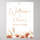 Chá de panela de Boho Floral Laranja Queimado Poster de Boho Bem-vindo Carinhosamente, chá de panela laranja queimado, sinal de boas-vindas apresentando algumas flores e folhagem em tons naturais, assim como um copo alto de champanhe. Este chá de panela floral moderno também apresenta um pomar branco na parte superior da placa.