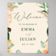 Belo sinal de boas-vindas do casamento para compartilhar seu dia especial com seus convidados. Este clássico cartaz de impressão de papel é perfeito para decorar sua recepção ou espaço de cerimônia, e tem tons pastéis macios e florais aquosos modernos em tons de pêssego, branco, marfim creme, sábio e um verde mais brilhante. Este evento personalizado fornece coordenadas acessórios com a nossa coleção floral de cheio botânico boho de papelaria e artigos de papel para eventos.