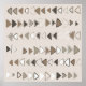 Um padrão geométrico de linhas opostas de triângulos recheados e esboçados numa paleta escura, esticada e marfim.