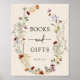 Este sinal de 'livros e presentes' do na moda & chá de fraldas elegante | poster apresenta flores silvestres, pintadas à mão, lindíssimas, feitas com aquarelas, organizadas como belíssimas curvas e elegantes planos de caligrafia. Localize itens correspondentes na Coleção de Chás de fraldas de flor selvagem do Boho.