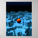 Trabalho de arte digital de uma esfera vermelha tridimensional que se equilibra na borda de uma paisagem de montanha azul geométrica