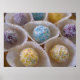 Um poster excelente com bolas coloridas de bolo em amarelo, azul e lavanda com aspersores. Excelente para uma padaria, restaurante, café ect.