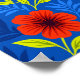 The design features a repeating floral pattern composed of large, stylized flowers with smooth, rounded petals. The flowers are colored in a vivid vermilion red, giving them a warm and energetic appearance. Each flower has a dark red center that adds depth and visual intensity. Surrounding the flowers are elegant leaves in bright green and olive green tones, created with clean and simple shapes. Additional leaf elements in different blue shades enrich the design and blend naturally with the composition. The background is a deep blue color that enhances the contrast and highlights the floral elements. The overall style is flat, decorative, and modern, with bold colors and clear shapes.