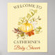 Este poster de boas-vindas ao chá de fraldas bonito apresenta um fundo de bolinhas amarelo e branco com uma abóbora de aquarela e folhas decorativas de outono. Adicione seu nome para personalizar este sinal de boas-vindas para seu dia especial.
