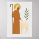 Trabalho de arte cristão minimalista do Bom Pastor segurando um funcionarios e parado com um cordeiro. Um lembrete pacífico da orientação e do cuidado de Deus.