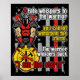 Presentes de bombeiro com guerreiro de Troia em cores de bombeiro de armadura vermelha e cinza. Guerreiro de combate a incêndios segura crachá amarelo e vermelho como escudo. O destino sussurra para o guerreiro que você não pode suportar a tempestade. O guerreiro sussurra que eu sou a TEMPESTADE.