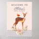 Um poster chá de fraldas com uma linda pomba marrom com manchas brancas no pelo. Um pássaro giro sentado nas costas do veado. Um arranjo de flores elegante composto por rosas de aquarelas e folhas verdes claras. Uma borda de bolinhas azul com fundo colorido de pêssego ao longo da parte inferior. Querido e design adorável.