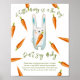 Convites para chuveiros de bebês neutros em termos de gênero. Apresentando o ditado "UM PEQUENO BUNNY ESTÁ A CAMINHO!", uma ilustração de um coelho aquoso (coelho) com cenoura em patas, e muitas cenouras cor de laranja. Itens correspondentes disponíveis.