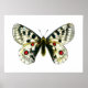 Parnassius apollo, um belo desenho vintage de uma borboleta negra, branca e vermelha.