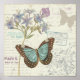 © Pela Studio / Maçã selvagem. Uma borboleta azul e marrom com uma flor roxa. Há uma silhueta de borboletas no fundo, assim como palavras francesas.