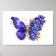 Borboleta de flores cinza, azul, safira, espumante com asa decorada com flores preciosos azuis com folhas de ouro sobre fundo branco.