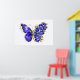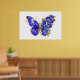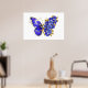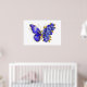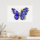 Borboleta de flores cinza, azul, safira, espumante com asa decorada com flores preciosos azuis com folhas de ouro sobre fundo branco.