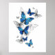 Borboletas azuis voadoras morfo e borboletas brancas em um fundo de abstrato leve. Morpho. Design com borboletas azuis morfo.