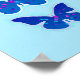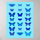 Poster num conjunto de borboletas salpicadas em tons de azul de cobalto e violeta, sobre um fundo azul claro do céu