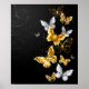 Borboletas Douradas, joias e brancas sobre fundo preto. Borboleta ouro.