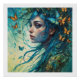 Uma mulher de cabelo fluente e de cor aqua está rodeada por numerosas borboletas coloridas, acrescentando uma sensação de capricho e magia à cena. Sua expressão é serena, mas cativante, se harmonizando com as vibrantes borboletas fluindo ao seu redor.