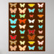 Impressão num conjunto de borboletas em tons de turquesa, aqua, laranja de coral, ouro e ferrugem sobre fundo castanho de chocolate