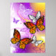 Laranja, borboletas monarcas detalhadas sobre luz, roxo, pitoresco, fundo pintado.
