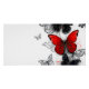 Bando de borboletas voadoras, realistas, vermelhas e pretas em fundo branco com gotas de tinta.