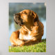 Poster, com uma imagem de alta definição de um belo cão Boerboel deitado na grama, em frente ao rio, enquanto desfruta do sol da madrugada com os olhos fechados. Personalizável