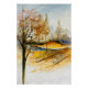 Deze aquarel legt een sereen herfstlandschap vast, waar zachte tinten goud, bruin en blauw een serene, dromerige sfeer oproepen. Kale bomen staan sierlijk tegen een mistige achtergrond, hun tere takken reiken omhoog. De zachte kleurovergang en losse penseelstreken creëren een gevoel van beweging en vredige eenzaamheid, en nodigen de kijker uit om in dit stille, poëtische tafereel rond te dwalen.