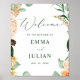Belo sinal de boas-vindas do casamento para compartilhar seu dia especial com seus convidados. Este clássico cartaz de impressão de papel é perfeito para decorar sua recepção ou espaço de cerimônia, e tem tons pastéis macios e florais aquosos modernos em tons de pêssego, branco, marfim creme, sábio e um verde mais brilhante. Este evento personalizado fornece coordenadas acessórios com a nossa coleção floral de cheio botânico boho de papelaria e artigos de papel para eventos.
