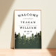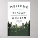Bem-vindos convidados para o seu casamento rústico, florestal ou de montanha com o nosso poster de pinheiros de altas dimensões, com uma fronteira inferior de pinheiros verdes em tons ricos de verde caçador. Adicione seus nomes, data de casamento e texto de boas-vindas personalizado usando os campos fornecidos.
