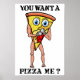 Um desenho engraçado em uma pizza vestindo luvas de boxe. A pizza tem grandes olhos azuis e está pronta para uma luta de boxe. O slogan diz "você quer uma pizza para mim"