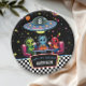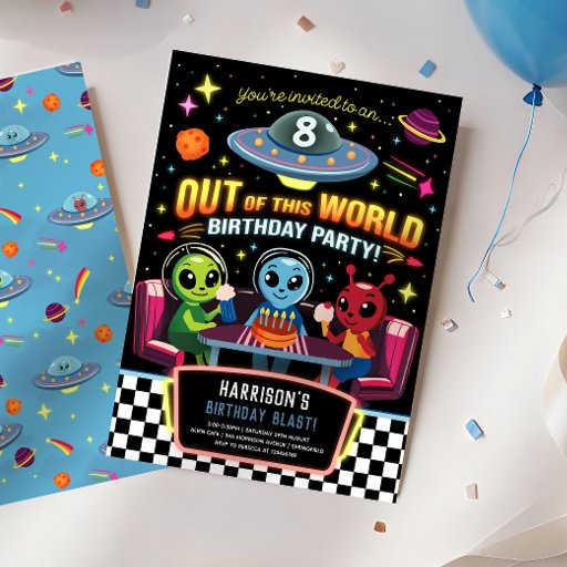 This Out of This World custom sign features a cute green alien with planets, stars, and a UFO in a fun retro neon space style. Personalize with your own text for your space themed birthday party.