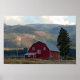"Bozeman, Montana, Barn" de Catherine Sherman. À tarde, o sol clareia as montanhas Absaroka atrás de um celeiro vermelho perto de Bozeman, Montana. Além das montanhas, fica o Parque Nacional Yellowstone em Wyoming. Os Absarokas fazem parte das Montanhas Rochosas.