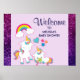 Bem-vindo poster de chá de fraldas. Projetado com um unicórnio branco com rico colorido e cauda. Um unicórnio bebê deitado ao seu lado, com um pacificador verde na boca. Um arco-íris colorido com nuvens lisas, e algumas estrelas e corações decoram este doce e adorável design. Um contorno cor-de-rosa em negrito ao redor da imagem lhe dá uma vibração de rabisco em forma de criança. Fundo cor-de-rosa-púrpura claro e colorido. As bordas esquerda e lateral de carona têm uma imagem de faux-glitter rosa púrpura.