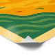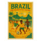 Poster de viagens vintage de retroinspirada no estilo dos anos 50. Primeiro plano: uma cena dinâmica de crianças e jogadores jogando futebol descalço na praia, com uma clássica bola branca e negra em movimento. Linha do horizonte Rio de Janeiro com Cristo Redeemer