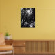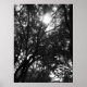 Este atraente impressão preto-e-branco apresenta o brilho do sol brilhante brilhando através dos galhos das árvores.