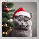Gato de shorthair britânico azul/cinza bonito vestindo um chapéu de Papai Noel.