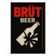 Affiche percutante et sans concession, typique du brutalisme graphique. Un fond noir mat. En son centre, un mot “BRÜT” en capitales massives rouges, dont les lettres semblent écrasées sous leur propre poids. En dessous, un pictogramme angulaire et brutal d’une bouteille de bière fendue en deux, en blanc pur, éclaboussant des éclats géométriques. Aucune fioriture : pas de texture, des formes dures, contrastes radicaux. Une fine ligne verticale jaune divise l’affiche, évoquant une fracture. L’ensemble inspire une force radicale, industrielle, presque militante.