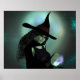 Uma bruxa sorridente vestida de preto vestindo um chapéu preto alto lança um feitiço orbital brilhante.