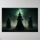 Entra num mundo de encantamento negro com esta enigmática ilustração da tríplice bruxa. Esta trabalho de arte apresenta três bruxas misteriosas, coladas em teias elaboradas e medievais e chapéus de torre, exuando uma aura de poder arcana. Esta impressão de arte de fantasia gótica é perfeita para fãs de temas de bruxaria, estética mágica escura e decor místico.