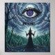 Esta poster apresenta uma exploração filosófica do poder, da autoridade e da percepção através da representação de um grande olho sugerindo onisciência, lembrando o "Olho da Providência". Abaixo, uma figura solitária em túnica escura representa uma bruxa ou feiticeiro, comandando uma tempestade, simbolizando um choque entre a vontade individual e as forças externas. A frase "NO KINGS" rejeita a autoridade hierárquica, defendendo ideais descentralizados. Os contrastes artísticos entre luz e sombra refletem turbulência e a luta pela autodeterminação, provocando a contemplação de quem assiste, comanda e resiste no contexto da autoridade.