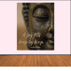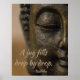 Boa foto de Buda com sua famosa citação: A JUG FILLS DROP BY DROP. Cores castanho e bege com letra de script.