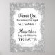 Este letreiro de buffet de doces cintilante prateado será o complemento perfeito para a barra de doces no seu casamento, aniversário, chá de noiva ou chá de bebê. Ele apresenta um fundo cintilante prateado com um recorte de moldura com a frase "Obrigado por tornar esta noite tão doce Por favor, pegue um saco e encha-o com guloseimas".