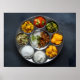 Um Buffet de Thali Veg Étnico Indiano. Um belamente apresentado hindu veg thali indiano, apresentando uma variedade de pratos vegetarianos tradicionais numa mesa escura de concreto.