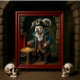 Esta imagem encantadora apresenta um Bulldog Francês branco e preto, magníficamente vestido como capitão pirata, vestindo um chapéu tricórnio e um elaborado casaco azul com um brilho dourado. Baixo, um colete marrom com detalhes intrincados de ouro adiciona ao conjunto. O distinto canino mantém-se confiante, com uma pata sobre um baú do tesouro aberto, transbordando de moedas de ouro, incorporando um explorador sério, mas adorável.