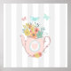 Um poster com uma ilustração caprichosa. Um bule cor-de-rosa com um pequeno coração cor-de-rosa no centro e um buquê de flores. Delicar borboletas coloridas com sabor a flecha. Colocado sobre uma cinza e fundo listrado branco.