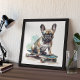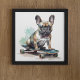 pintura aquarela de um bonito buldogue francês sentado num skate