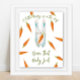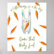 Convites para chuveiros de bebês neutros em termos de gênero. Apresentando o ditado "UM PEQUENO BUNNY ESTÁ A CAMINHO!", uma ilustração de um coelho aquoso (coelho) com cenoura em patas, e muitas cenouras cor de laranja. Itens correspondentes disponíveis.