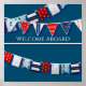 Design de cotovelagem náutica com embarcações de vela, âncoras, cartazes difusos e faixas nas cores vermelha, branca e azul, típicas da vida náutica e costeira e dos temas marítimos. Personalizar para seu gosto (até mesmo excluir ou alterar texto).
