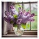 Lilases roxas em vaso de vidro velho em prato de madeira em fazenda