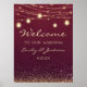 Banner / sinal de boas-vindas com luzes elegantes de cordas e lanternas rusticadas sobre fundo de burlôncio com ouro brilhante. Este sinal combina com a nossa Coleção de Casamentos de Luzes de Corda Luminosa Dourada Burgundy. Entre em contato conosco para obter ajuda com a personalização ou para solicitar produtos correspondentes.