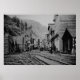 Foto histórica de Burke, cidade do boom mineiro de Idaho, tirada no final do século 19. A cidade estava situada num desfiladeiro profundo e estreito de apenas 100 metros de largura. Por isso, os comboios correram pela rua principal e pelo lobby do Hotel Tiger. Canyon Creek também correu pelo lobby do hotel. Merchants disse que se não retraíssem os avisos...um trem passante os tiraria do prédio. Resta apenas algumas instalações mineiras e alguns edifícios abandonados aqui e ali na zona da cidade.