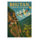 Poster de viagens retrô do Butão, aninhado nos Himalaias. Em primeiro lugar: o majestoso Paro Taktsang (mosteiro do Ninho de Tiger) tocou dramaticamente num lado do penhasco, suas paredes brancas e telhados vermelhos brilhando sob a luz do sol
